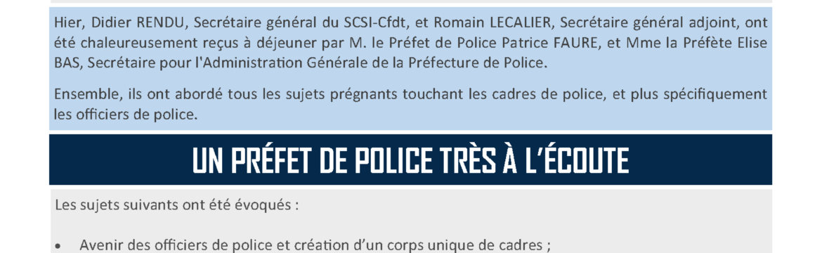 Ce jour, Didier RENDU, Secrétaire général du SCSI-Cfdt, et Romain LECALIER, Secrétaire général adjoint, ont été chaleureusement reçus à déjeuner par M. le Préfet de Police Patrice FAURE, et Mme la Préfète Elise BAS, Secrétaire pour l’Administration Générale de la Préfecture de Police.