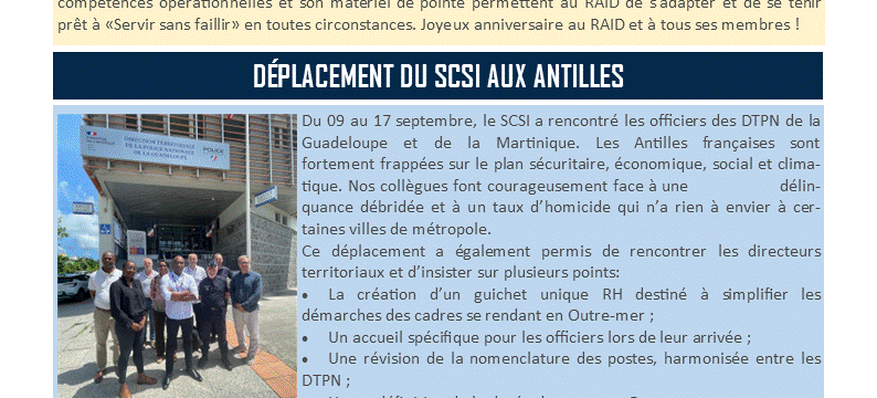 Du 09 au 17 septembre, le SCSI a rencontré les officiers des DTPN de la Guadeloupe et de la Martinique. Les Antilles françaises sont fortement frappées sur le plan sécuritaire, économique, social et climatique. Nos collègues font courageusement face à une délinquance débridée et à un taux d’homicide qui n’a rien à envier à certaines villes de métropole.