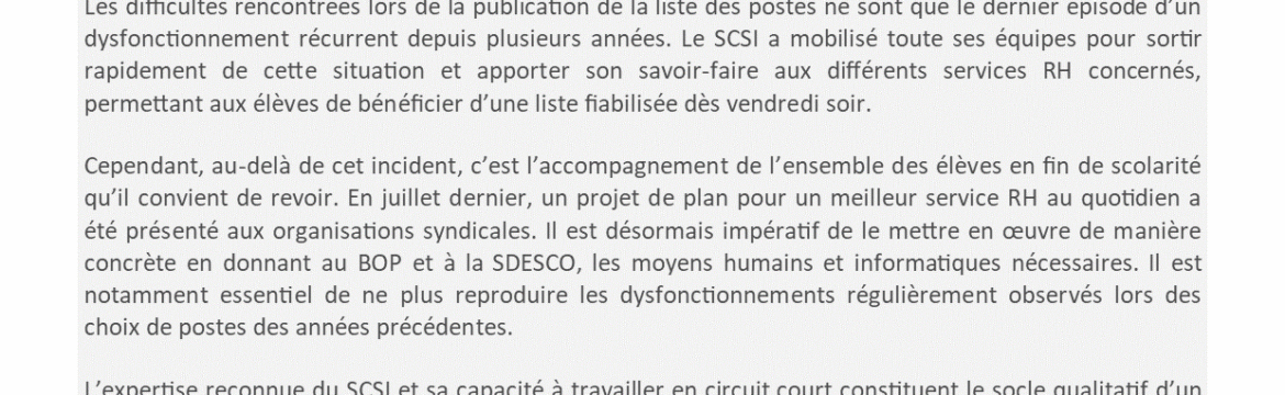 Les difficultés rencontrées lors de la publication de la liste des postes ne sont que le dernier épisode d’un dysfonctionnement récurrent depuis plusieurs années. Le SCSI a mobilisé toute ses équipes pour sortir rapidement de cette situation et apporter son savoir-faire aux différents services RH concernés, permettant aux élèves de bénéficier d’une liste fiabilisée dès vendredi soir.