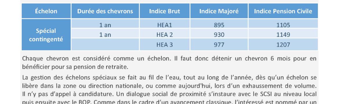 La gestion des échelons spéciaux se fait au fil de l’eau, tout au long de l’année, dès qu’un échelon se libère dans la zone ou direction nationale, ou comme aujourd’hui, lors d’un exhaussement de volume. Il n’y pas d’appel à candidature. Un dialogue social de proximité s’instaure avec le SCSI au niveau local puis ensuite avec le BOP. Comme dans le cadre d’un avancement classique, l’intéressé est nommé par un arrêté individuel.