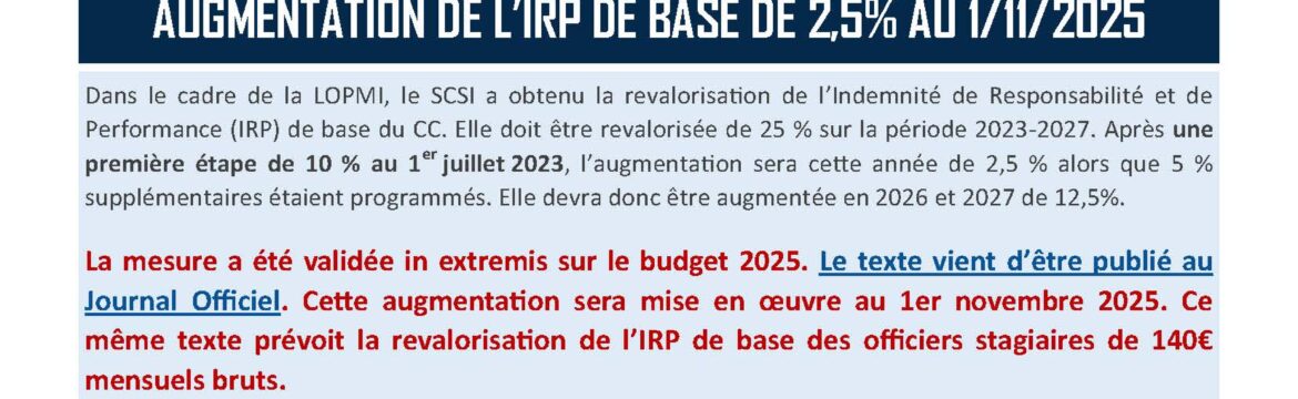 Dans le cadre de la LOPMI, le SCSI a obtenu la revalorisation de l’Indemnité de Responsabilité et de Performance (IRP) de base du CC. Elle doit être revalorisée de 25 % sur la période 2023-2027. Après une première étape de 10 % au 1er juillet 2023, l’augmentation sera cette année de 2,5 % alors que 5 % supplémentaires étaient programmés. Elle devra donc être augmentée en 2026 et 2027 de 12,5%.