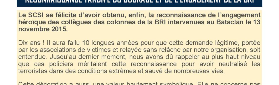 Le SCSI se félicite d’avoir obtenu, enfin, la reconnaissance de l’engagement héroïque des collègues des colonnes de la BRI intervenues au Bataclan le 13 novembre 2015.